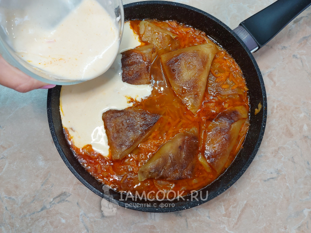Добавить в эту смесь один половник бульона из сковороды, перемешать. Так сметана точно не свернётся и не пойдёт хлопьями.