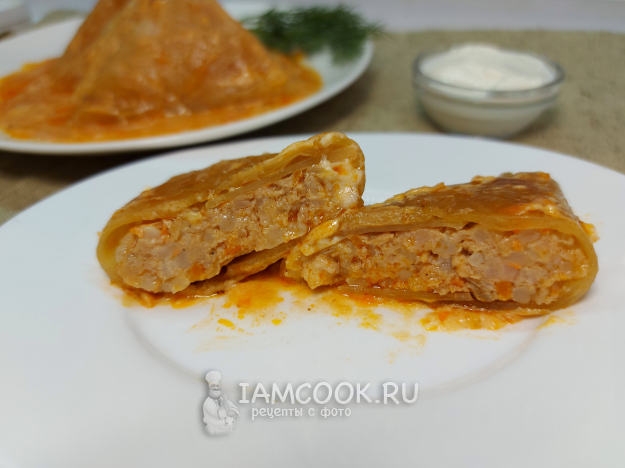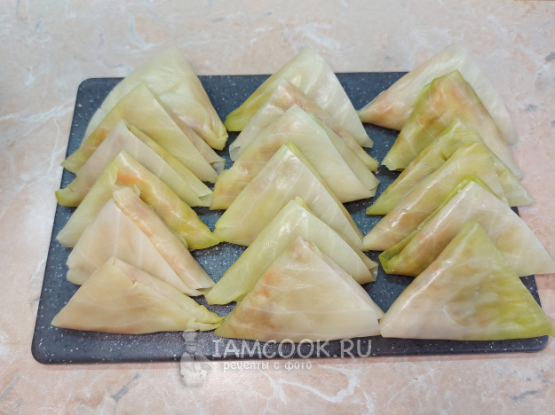 Классические голубцы треугольником готовы, подавать горячими. В разрезе они сочные и нежные.