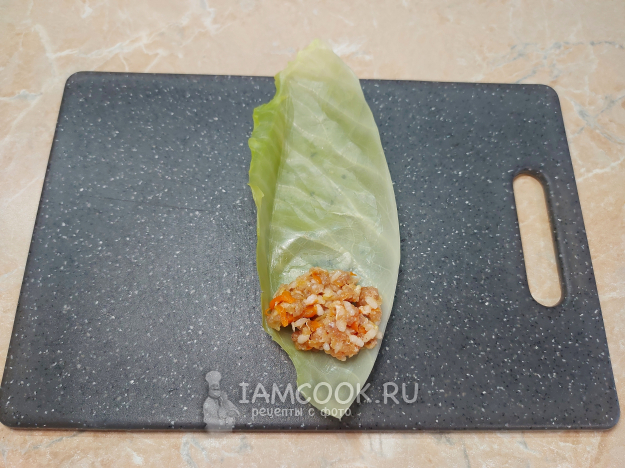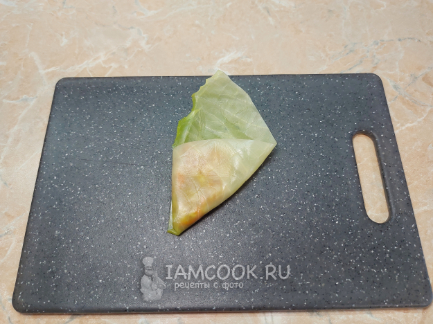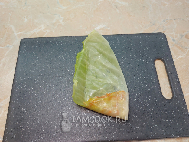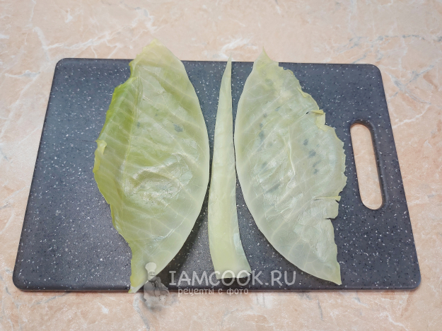 Лист капусты разделить на 2 части, вырезав утолщение по центру.
