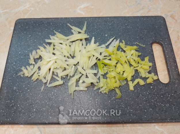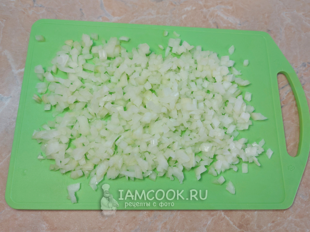 Одну большую луковицу или две средних нарезать мелким кубиком. Лука получится очень много, пусть вас не пугает такое количество - половина уйдёт на овощную подушку.