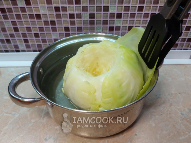 Большую кастрюлю наполнить водой наполовину, довести до кипения, добавить 2 ст.л. соли. Желательно выбрать такую кастрюлю, чтобы туда полностью поместился весь кочан. Если такой нет, капусту надо будет периодически переворачивать, чтобы жёсткое основание чаще было в кипятке. Поместить в кастрюлю кочан, и если останется место, долить кипяток из чайника. Варить несколько минут при слабом кипении, затем попробуйте снимать листья по одному, они должны легко отделяться. Время варки зависит от жёсткости капусты. Середине надо немного больше времени, чтобы размягчиться. Воду, в которой варилась капуста, не выливайте - она ещё понадобится.