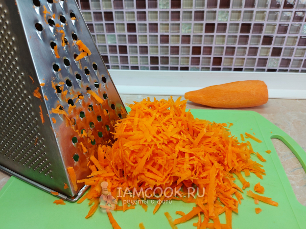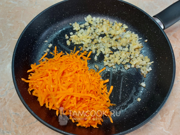 На сковороде разогреть растительное масло и обжарить половину измельчённого лука до лёгкой золотистости, затем добавить половину натёртой моркови и пассеровать их вместе пару минут.
