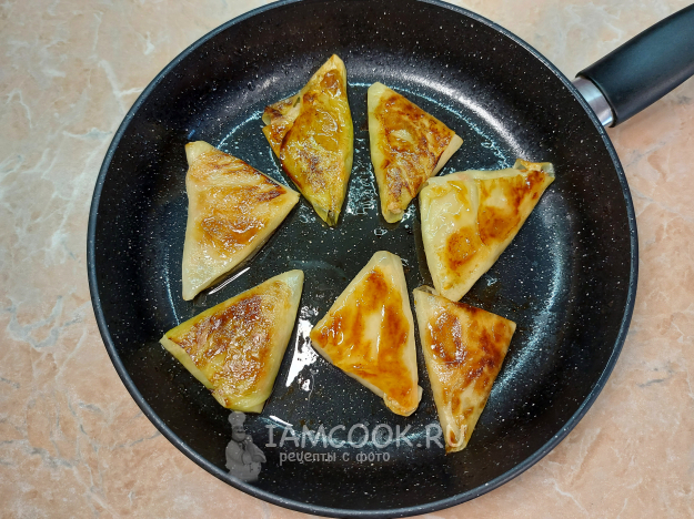 Обжарить треугольники на разогретом растительном масле, на среднем огне, по 5-7 минут с каждой стороны - до появления аппетитной румяной корочки.