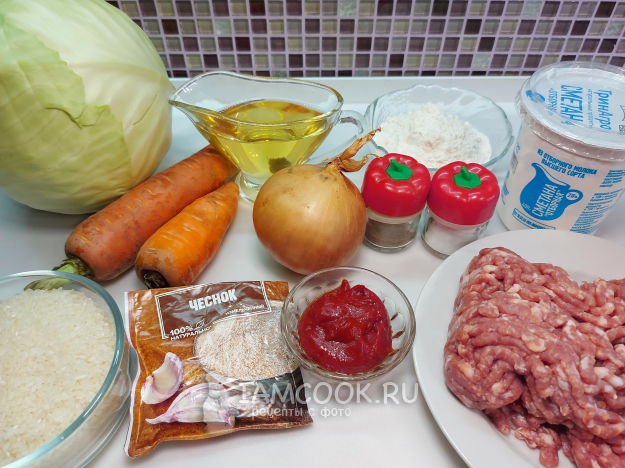 Продукты для приготовления голубцов треугольником по классическому рецепту соберите по списку. Фарш я обычно использую готовый классический (смесь свинины и говядины), но можно взять и другой по своему вкусу. Рис подойдёт больше обыкновенный круглый - он более клейкий и лучше сочетается с фаршем.