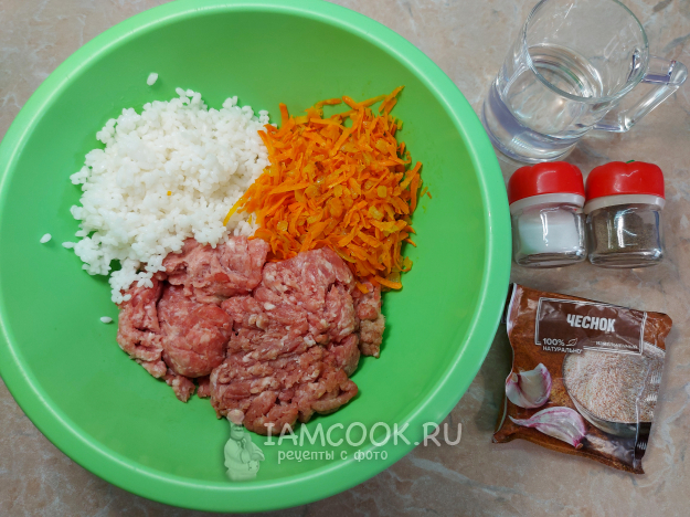 Для начинки в глубокой миске смешать фарш, рис, пассерованные овощи, соль и сушёный чеснок - по половине чайной ложки, щепотку чёрного молотого перца, влить 100 мл холодной воды. Перемешивать руками и стараться не помять рис.
