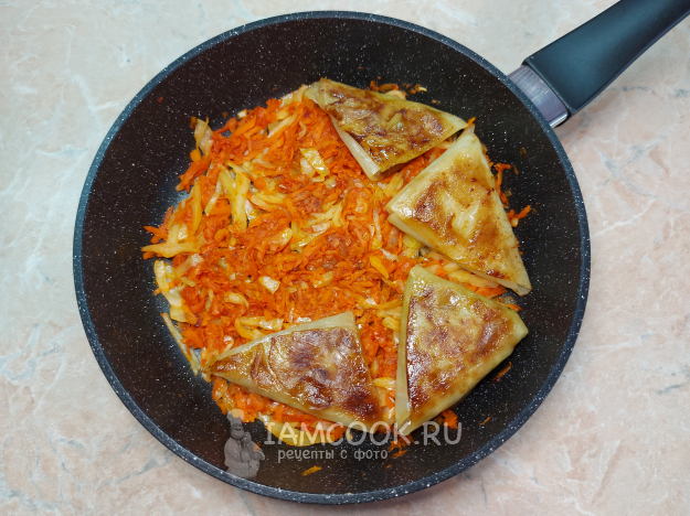 Завернуть нижний край так, чтобы было похоже на треугольник, пальцами равномерно распределить начинку.