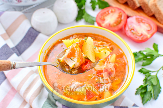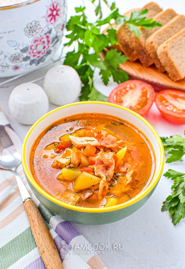 Разлейте томатный суп с курицей в тарелки и подавайте к столу. Приятного аппетита!