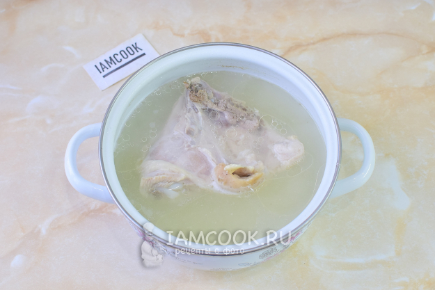 Курицу залейте водой и доведите до кипения. Снимайте пенку, которая будет появляться при нагреве. Варите курицу 15-20 минут.