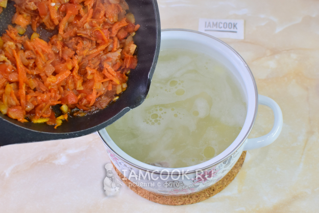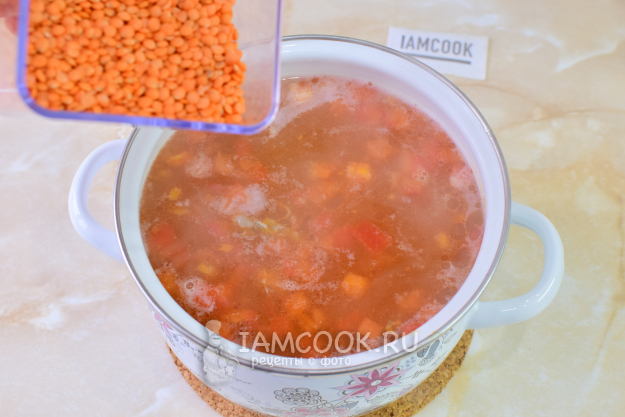 Сразу же добавьте чечевицу. У меня чечевица быстрого приготовления, поэтому я её добавляю в конце приготовления. По вкусу добавьте в суп соль и специи. Проварите все вместе минут 10.