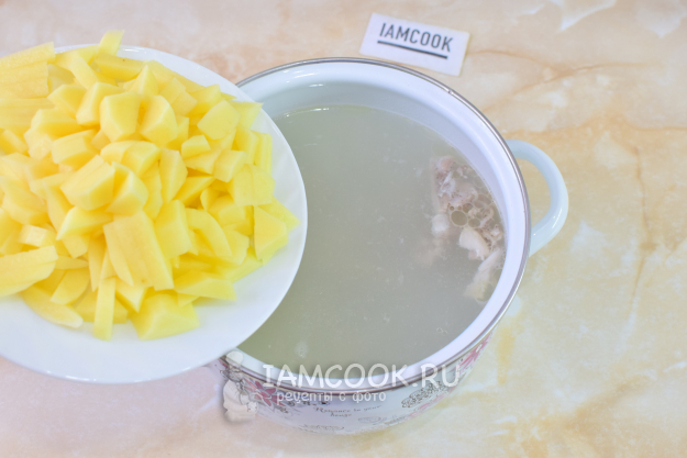 Готовое куриное мясо отделите от костей и верните обратно в процеженный бульон. Следом добавьте картофель, нарезанный на кусочки. Оставьте вариться минут на 10-15.