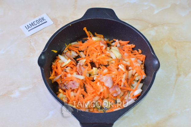 Добавьте к бекону лук и морковь. Перемешайте. Обжарьте все вместе еще 2-3 минуты на небольшом огне.