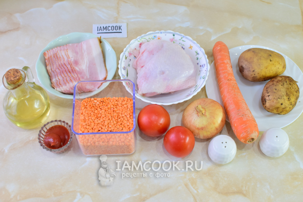 Чтобы приготовить томатный суп с курицей, соберите необходимые ингредиенты по списку. Для варки можно взять любую часть курицы, но лучше взять с костями. Так бульон будет наваристей. Я беру куриное бедро.