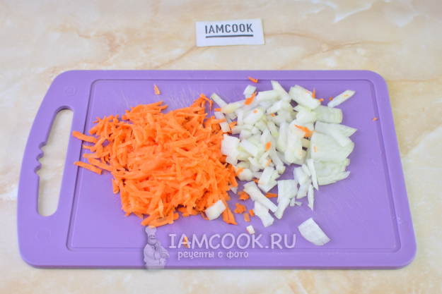 В это время очистите морковь и лук. Потрите морковь на терке, а лук мелко нарежьте.
