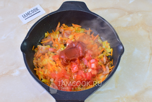 Следом добавьте нарезанные помидоры и томатную пасту. Потушите овощи 2-3 минуты.