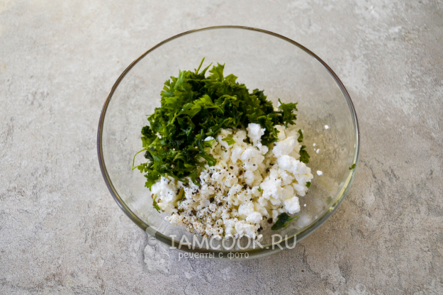 В миску положите творог, добавьте нарезанную свежую зелень, добавьте соль и черный молотый перец. Тщательно перемешайте продукты.