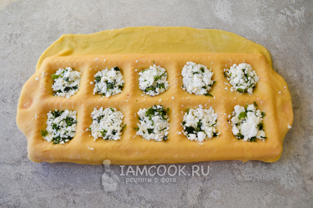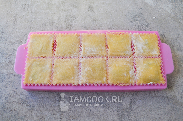 Я использую специальную форму для формовки равиоли. Положите тонкий пласт теста на форму. В каждую ячейку положите творожную начинку.