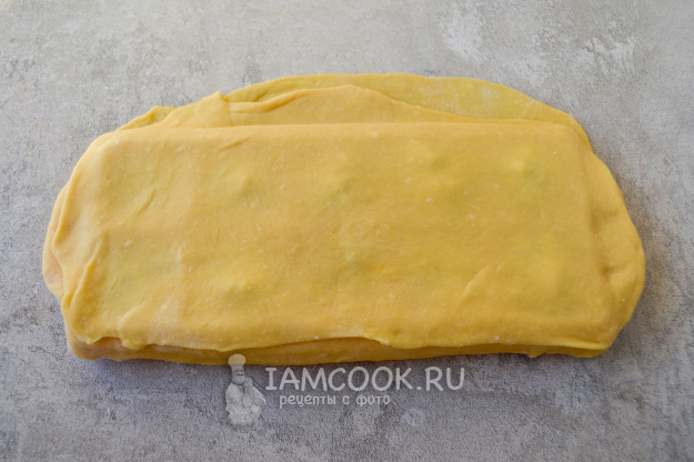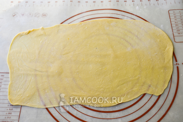 Отдохнувшее тесто раскатайте в тонкий пласт на посыпанном мукой столе.