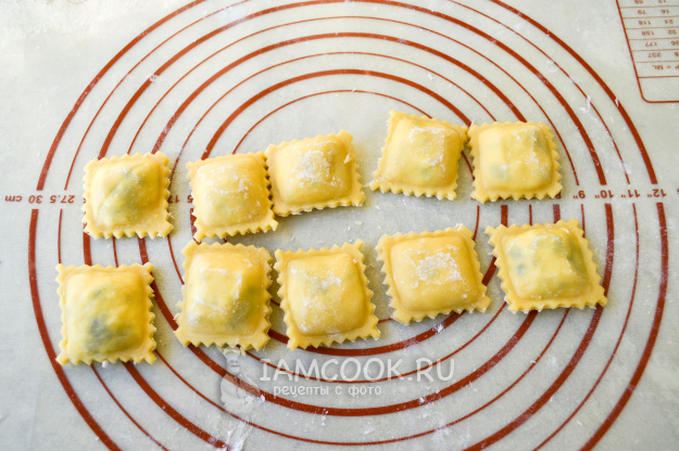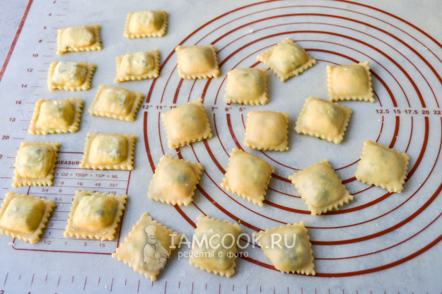 Чуть присыпьте пласт мукой и прокатайте скалкой. Обрезки теста соберите, скатайте в шар и используйте для приготовления следующей порции равиоли.