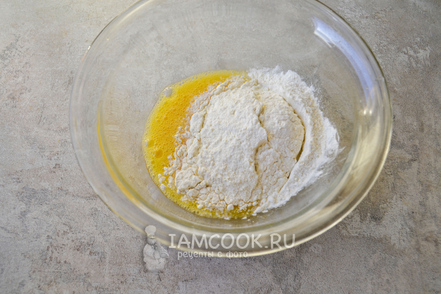 Взбейте яйца до пены венчиком или вилкой и всыпьте частями муку. Сначала перемешивайте тесто ложкой.