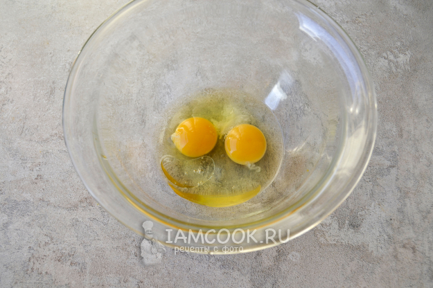 Для теста разбейте в миску яйца, добавьте щепотку соли и влейте ложку растительного масла.