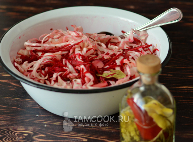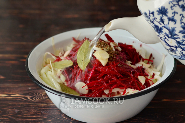 Через сутки заварная капуста со свеклой готова к дегустации! Её можно подать, полив ароматным подсолнечным маслом или просто так.