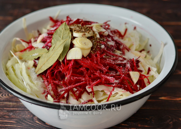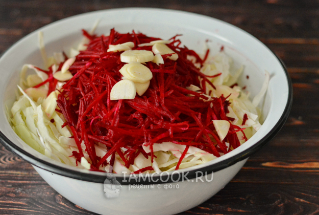 Нашинкуйте соломкой капусту. Свеклу натрите на корейской тёрке или нашинкуйте соломкой вручную. Чеснок нарубите крупно. Сложите всё в глубокую миску.