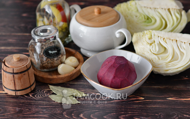 Соберите все продукты для приготовления заварной капусты со свеклой на зиму. Капусту очистите от верхних листьев, разрежьте на 4 части кочан и удалите кочерыжку. Свеклу и чеснок очистите и сполосните.