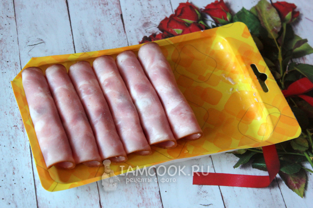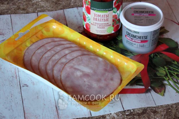 Для рулетиков с ветчиной и творожным сыром подготовьте ингредиенты по списку к рецепту. Ветчина может быть не только из свинины, но и из курицы или индейки. Кроме ветчины, берите карбонад или другие колбасные изделия большого диаметра. Удобны те, которые продаются в виде тонкой нарезки/слайсов. Количество вяленых помидоров – по вкусу.