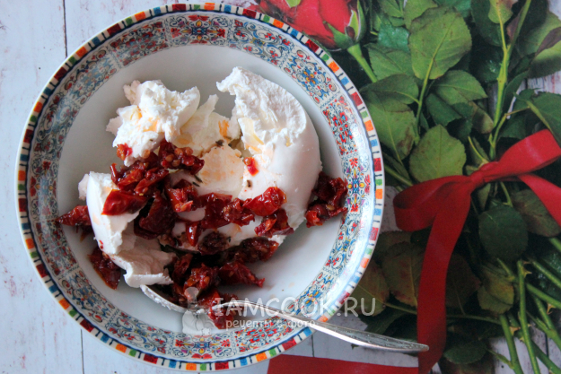 Для приготовления намазки соедините творожный сыр с кусочками вяленых помидоров. Для сочности можно добавить в состав немного ароматного масла от вяленых помидоров.