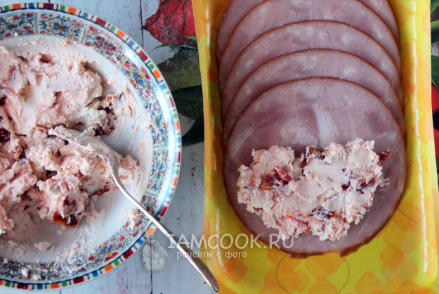 Намажьте творожную массу на всю поверхность ломтей ветчины или на 2/3.