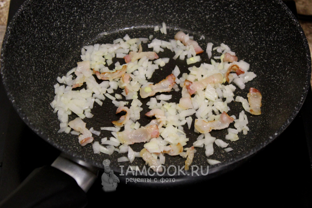 На жирной части бекона потомите лук на среднем огне при помешивании около 5 минут не в зажарку и шкварки, а до зарумянивания.