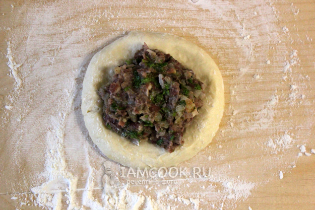 Разделите тесто на два куска. Каждый раздавите в небольшую лепешку так, чтобы можно было уложить на неё комок начинки.