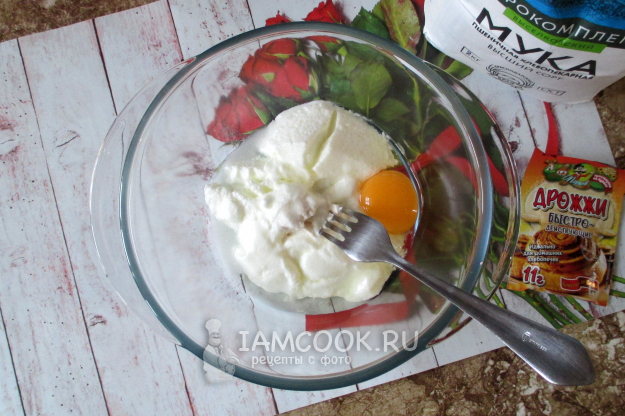 Для теста соедините густую кисломолочку с яйцом. Тут мацони и каймак.