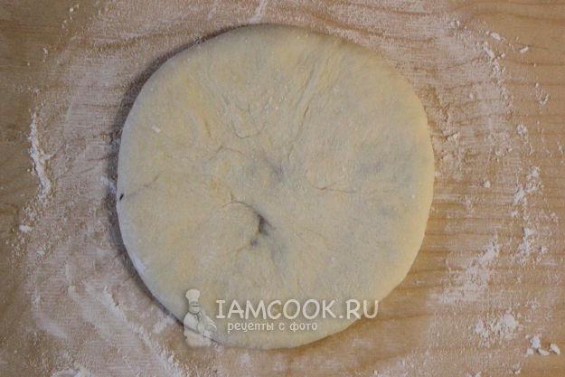 Теперь расплющите её руками так, чтобы получилась круглая лепешка. Желательная толщина - 1-1,5 см, но сразу такую не делайте! Перенесите заготовку на сковороду и там придайте нужную толщину до конца.