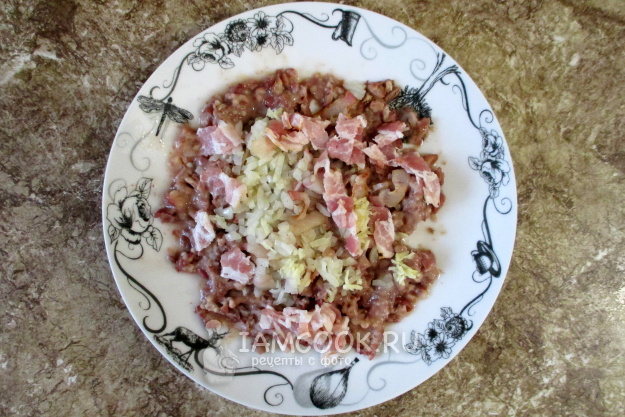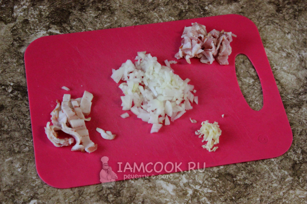 Для начинки разделите бекон на жирную и мясную части. Нарежьте каждую узкими кусочками. Лук мелко нашинкуйте, чеснок измельчите.