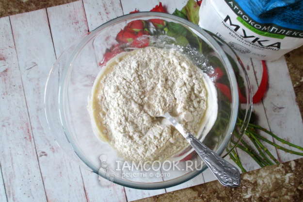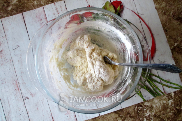 Добавьте муку с сухими дрожжами. Если будете готовить тесто без яйца, то муки может понадобиться поменьше.