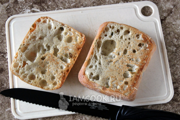 Чиабатта обычно довольно «ноздрявый» хлеб, поэтому мне нравится нарезать её не поперек на ломти, а на две части горизонтально и каждая будет с корочкой. Корочка удержит начинку и всё её соки. На горячей сковороде-гриль или обычной подсушите куски брускетты с обеих сторон.