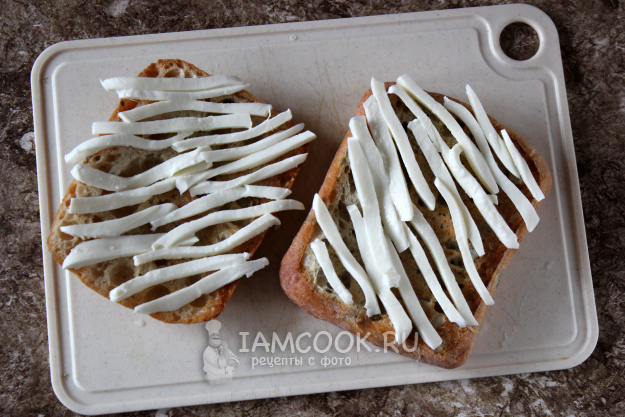 Шарик моцареллы нарежьте соломкой или иначе ломтями. Уложите её на два куска чиабатты поровну.