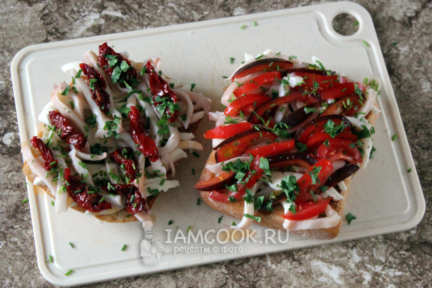 Для двух вариантов брускетты с кальмаром подготовьте ингредиенты по списку к рецепту. Готовый кальмар – это отварной, жареный, маринованный или копченый, т.е. любой, какой будет в наличии или нравится. Использую вяленые и свежие помидоры коктейльных сортов, но можете взять какой-то один вид. Вместо чиабатты и другой хлеб – тоже хорошо.