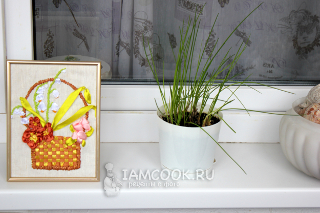 Шнитт-лук можно заменить зеленым луком или другой зеленью (укроп, базилик, кинза). Просто у меня почти круглый год есть шнитт-лук то в огороде, то на подоконнике. Он нежнее зеленого пера репчатого и очень мне нравится, но зелёный лук намного проще выращивать в режиме «огород на подоконнике». Кстати, красивую вышивку-аппликацию сделала автор рецептов на сайте Elena.D.