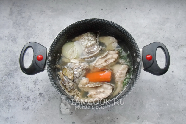 Поставьте кастрюлю на плиту. Варите карася 30-35 минут на самом минимальном огне, с приоткрытой крышкой кастрюли, чтобы бульон был прозрачным.