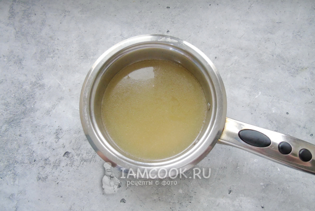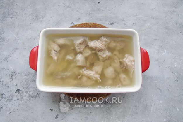 После достаньте из кастрюли отварную рыбу, а бульон процедите. Желатин залейте холодной кипяченой водой и дайте набухнуть. Затем выложите в горячий рыбный бульон и перемешивайте до полного растворения.