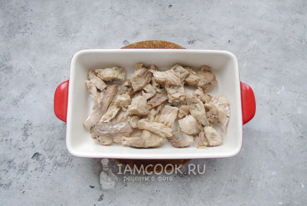 Отварного карася тщательно разберите, убирая косточки. Выложите в форму для заливного.