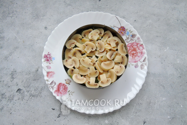 Маринованные грибы (у меня шампиньоны) нарежьте и выложите верх салата.