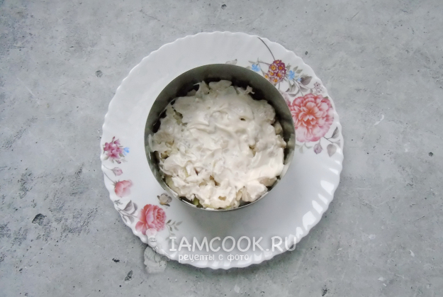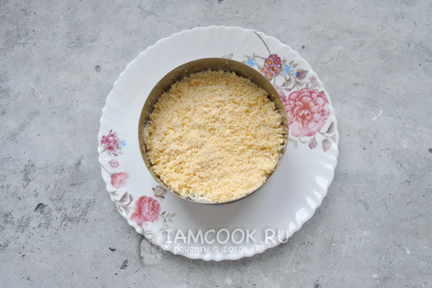 Желтки также натрите на терке или разомните вилкой. Выложите на белки и покройте майонезом.