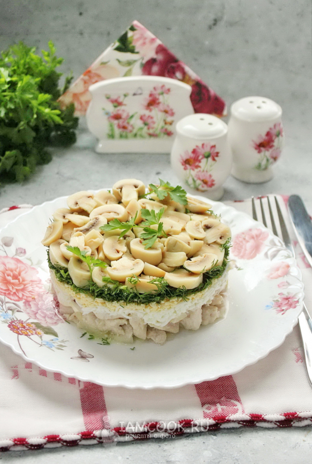 Салат «Мужской каприз» с курицей и грибами готов. Аккуратно снимите кольцо и подавайте салат к столу.