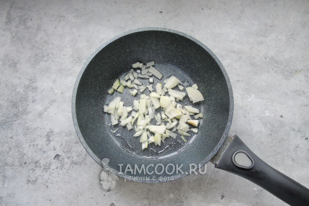 Репчатый лук очистите, помойте, мелко нарежьте и выложите в сковороду с подсолнечным маслом.