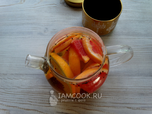 Количество ингредиентов не принципиальное - как говорится, кашу маслом не испортить. Количество фруктов (что на фото) и заварки я взяла для чайничка 0,6 л.