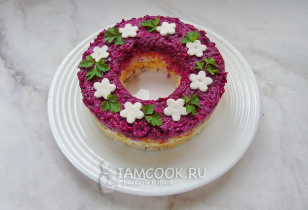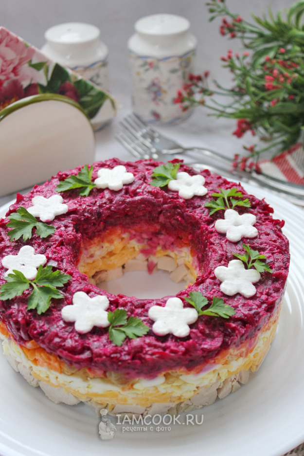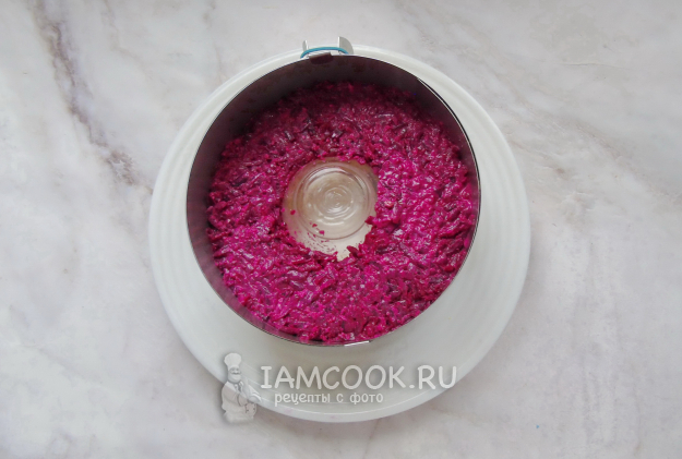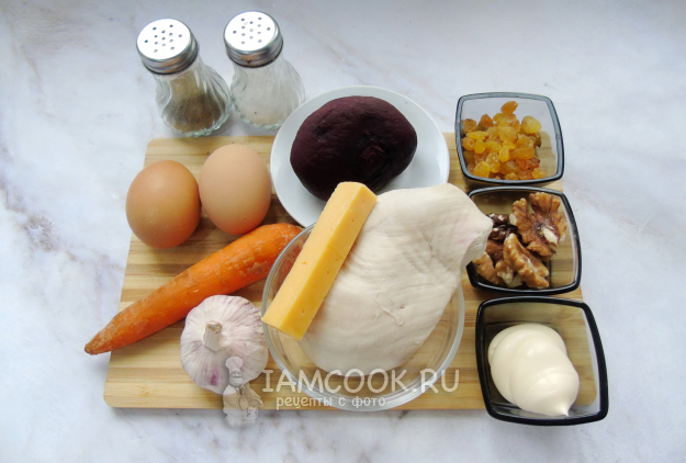 Сборка салата. Возьмите кольцо диаметром 15-16 сантиметров. Поставьте его на блюдо или большую тарелку. В середине поместите небольшой стакан или рюмку. Выложите ингредиенты в такой последовательности: первый слой - куриное филе, которое покройте майонезом. Второй слой - тертый сыр с чесноком и майонезом. Третий слой - тертые яйца, покройте их майонезом. Четвертый слой - морковь с изюмом и майонезом. И последний слой - свекла с орехами и майонезом.