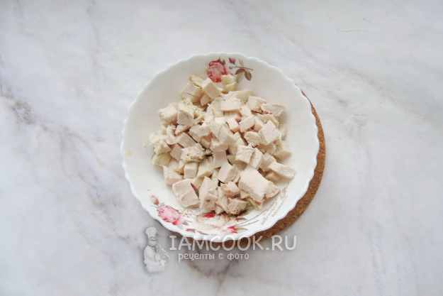 Куриное филе отварите. Выложите в кастрюлю, залейте водой, посолите по вкусу. Доведите до кипения. Затем огонь убавьте и снимите пену. Варите 15-20 минут, до готовности куриного филе. После достаньте из кастрюли, охладите и нарежьте небольшими кубиками. Можно поперчить.